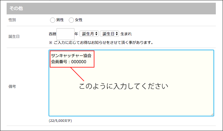 会員登録をする際に備考欄に会員番号を記載してください。